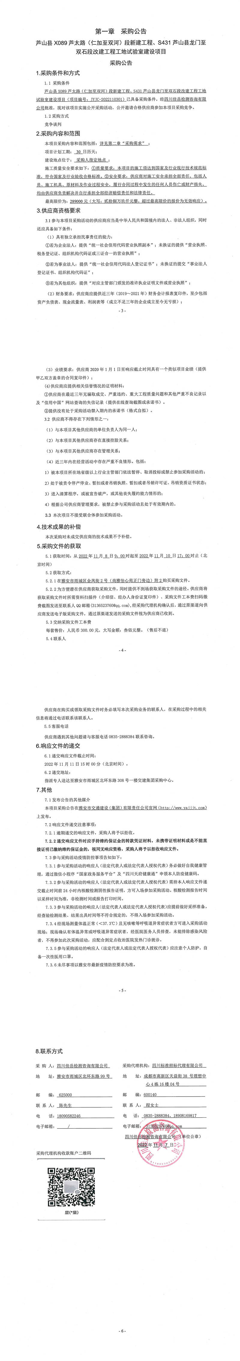 四川佳岳檢測(cè)咨詢有限公司蘆山縣X089蘆太路(仁加至雙河)段新建工程、S431蘆山縣龍門至雙石段改建工程工地試驗(yàn)室建設(shè)項(xiàng)目采購(gòu)公告