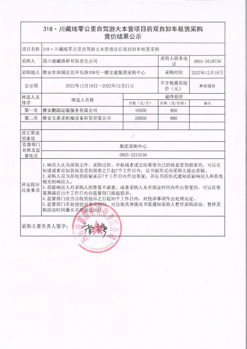 四川康藏路橋有限責(zé)任公司318·川藏線零公里自駕游大本營(yíng)項(xiàng)目后雙自卸車租賃采購(gòu)競(jìng)價(jià)結(jié)果公示