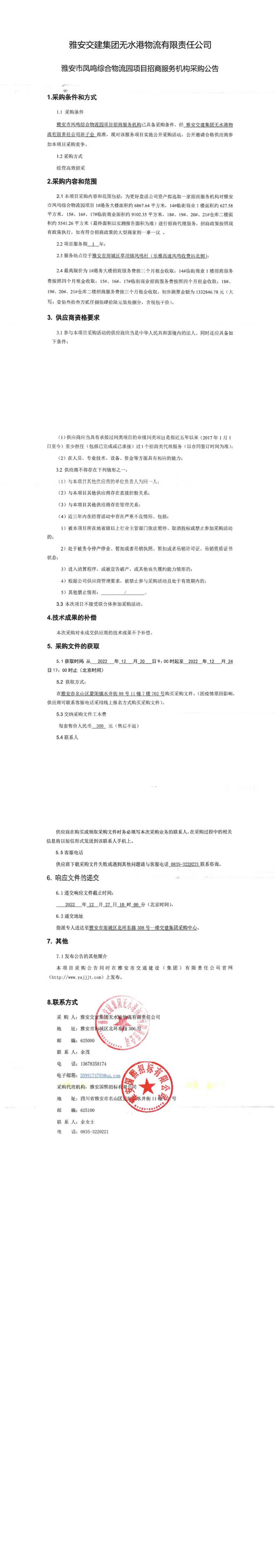 雅安交建集團無水港物流有限責任公司雅安市鳳鳴綜合物流園項目招商服務機構(gòu)采購公告