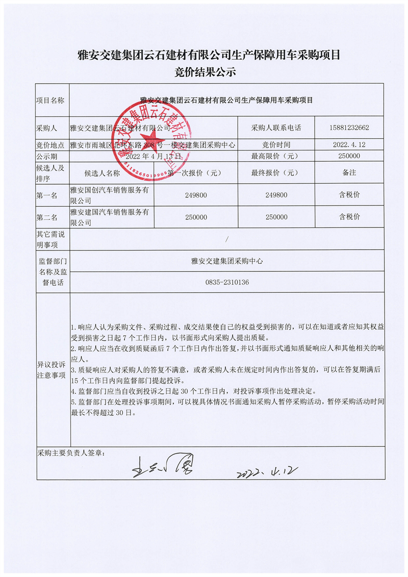 雅安交建集團(tuán)云石建材有限公司生產(chǎn)保障用車(chē)采購(gòu)項(xiàng)目競(jìng)價(jià)結(jié)果公示