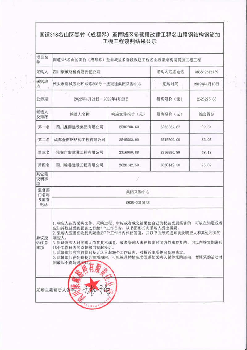 四川康藏路橋有限責任公司國道318名山區(qū)黑竹(成都界)至雨城區(qū)多營段改建工程名山段鋼結(jié)構(gòu)鋼筋加工棚工程談判結(jié)果公示