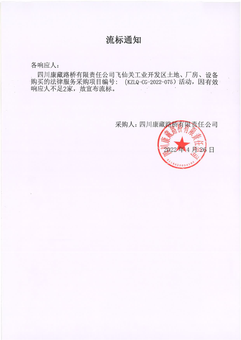 四川康藏路橋有限責(zé)任公司飛仙關(guān)工業(yè)開(kāi)發(fā)區(qū)土地、廠(chǎng)房、設(shè)備購(gòu)買(mǎi)的法律服務(wù)采購(gòu)項(xiàng)目流標(biāo)通知