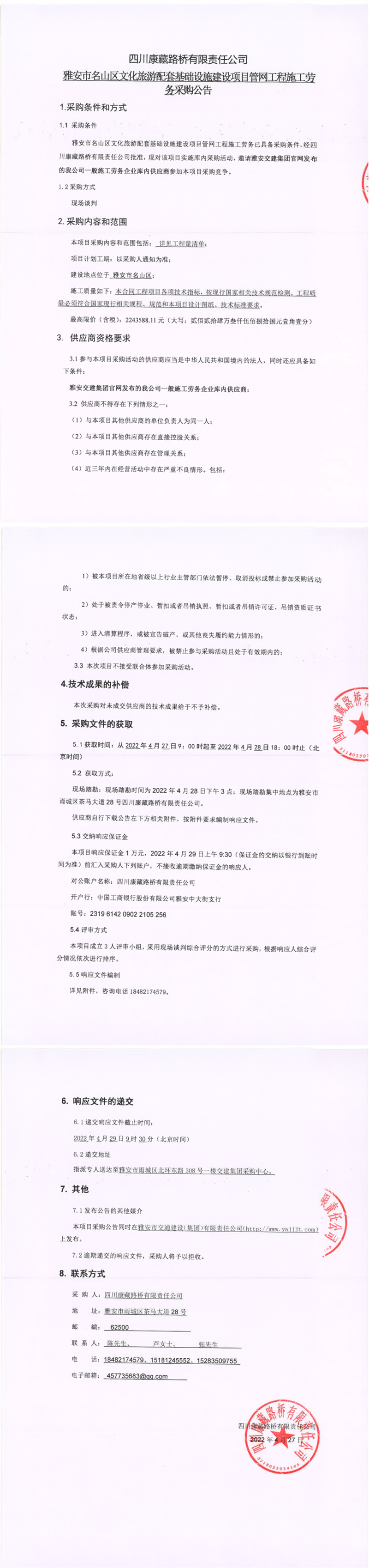 四川康藏路橋有限責(zé)任公司雅安市名山區(qū)文化旅游配套基礎(chǔ)設(shè)施建設(shè)項(xiàng)目管網(wǎng)工程施工勞務(wù)采購(gòu)公告