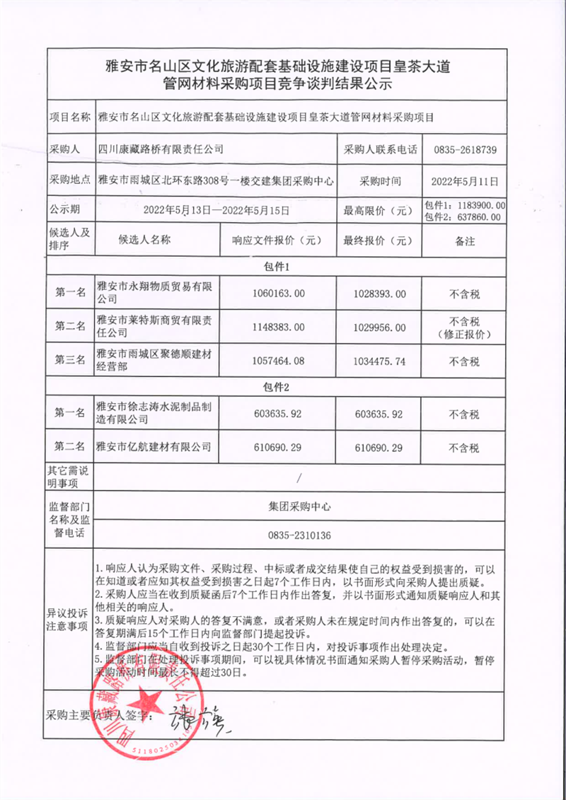四川康藏路橋有限責(zé)任公司雅安市名山區(qū)文化旅游配套基礎(chǔ)設(shè)施建設(shè)項目皇茶大道管網(wǎng)材料采購項目競爭談判結(jié)果公示