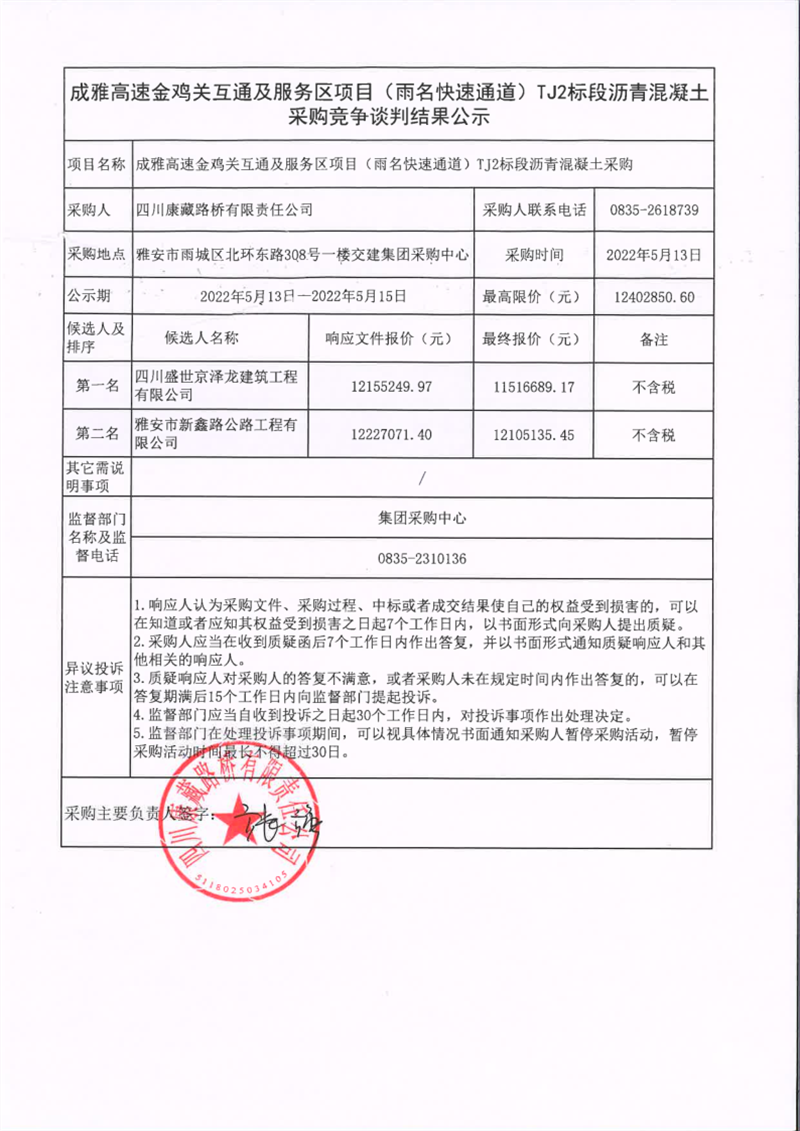 四川康藏路橋有限責任公司成雅高速金雞關(guān)互通及服務(wù)區(qū)項目(雨名快速通道)TJ2標段瀝青混凝土采購競爭談判結(jié)果公示
