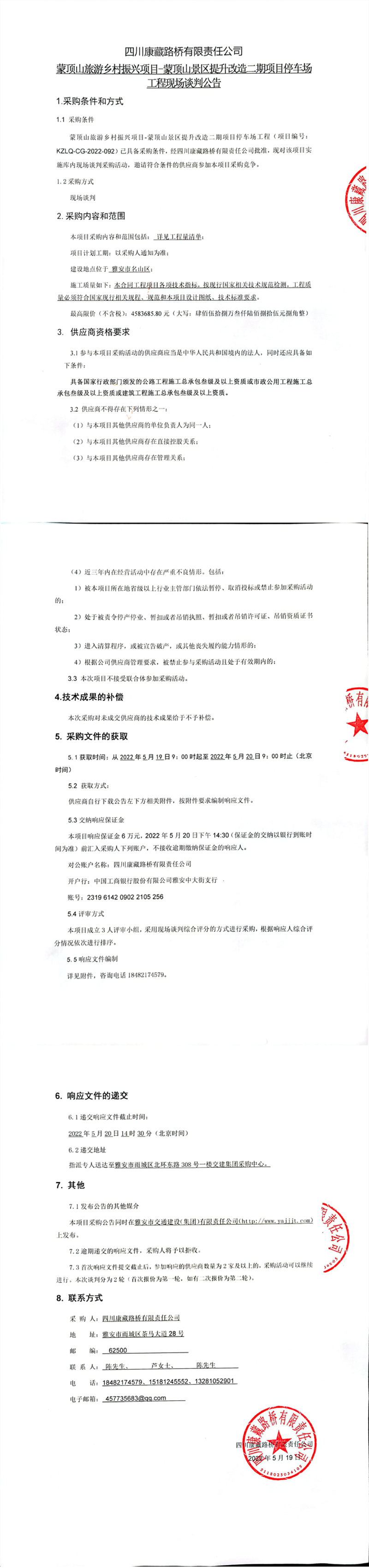 四川康藏路橋有限責(zé)任公司蒙頂山旅游鄉(xiāng)村振興項目-蒙頂山景區(qū)提升改造二期項目停車場工程現(xiàn)場談判公告