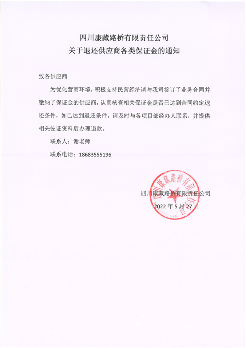 四川康藏路橋有限責任公司關于退還供應商各類保證金的通知