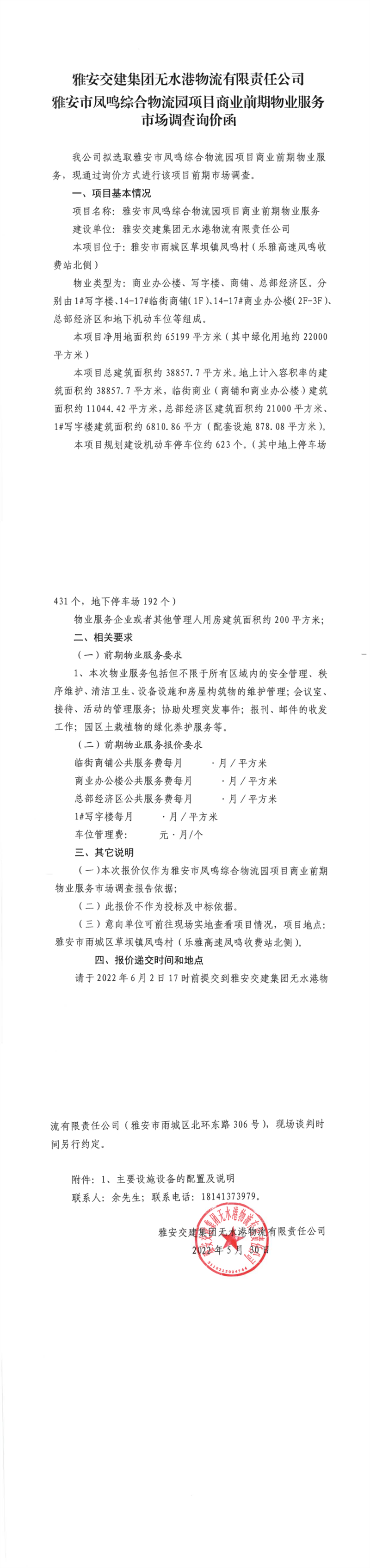 雅安交建集團無水港物流有限責任公司雅安市鳳鳴綜合物流園項目商業(yè)前期物業(yè)服務(wù)市場調(diào)查詢價函