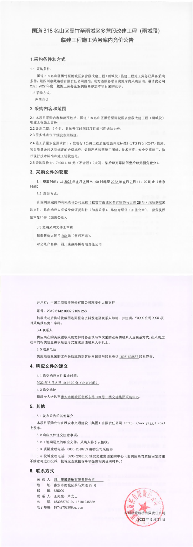 四川康藏路橋有限責(zé)任公司國(guó)道318名山區(qū)黑竹至雨城區(qū)多營(yíng)段改建工程(雨城段)臨建工程施工勞務(wù)庫(kù)內(nèi)競(jìng)價(jià)公告