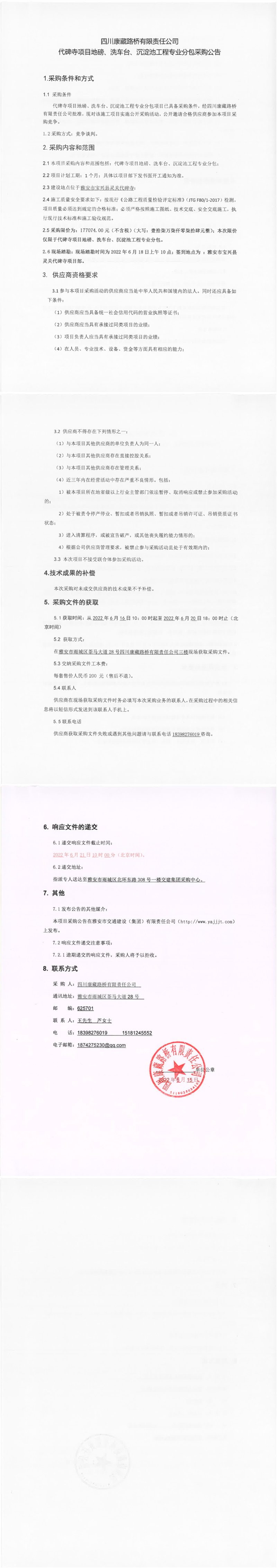 四川康藏路橋有限責(zé)任公司代碑寺項(xiàng)目地磅、洗車臺(tái)、沉淀池工程專業(yè)分包采購(gòu)公告