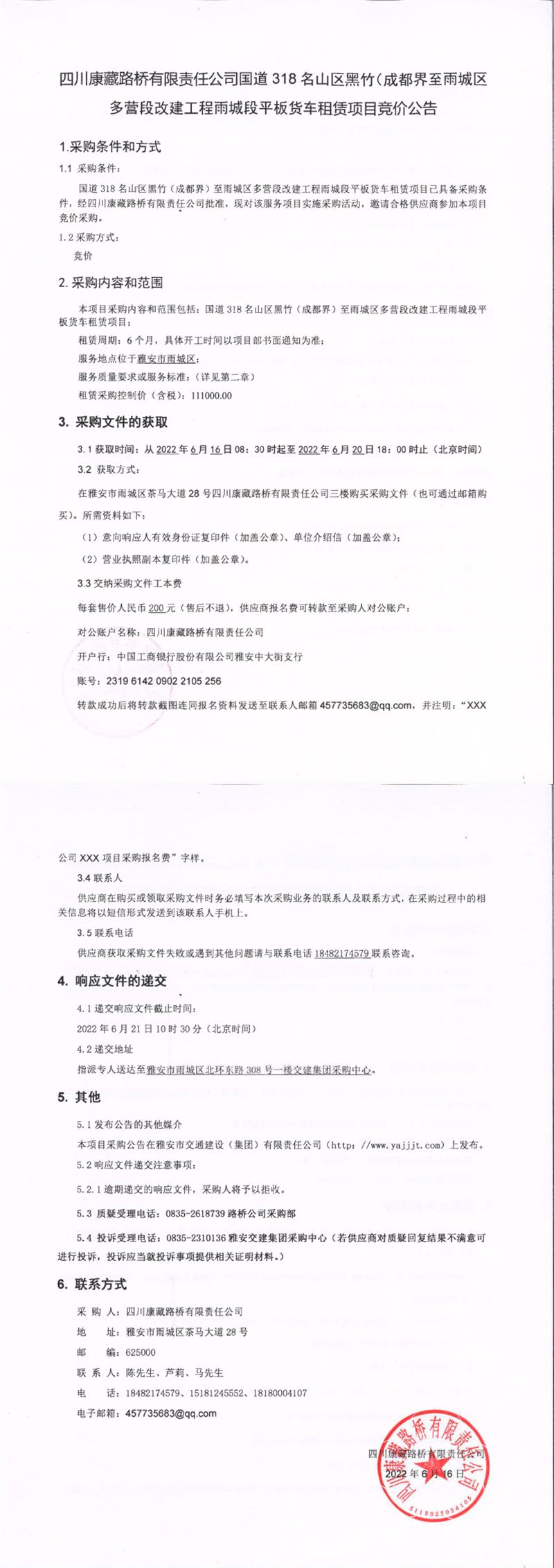 四川康藏路橋有限責(zé)任公司國道318名山區(qū)黑竹(成都界)至雨城區(qū)多營段改建工程雨城段平板貨車租賃項(xiàng)目競價(jià)公告