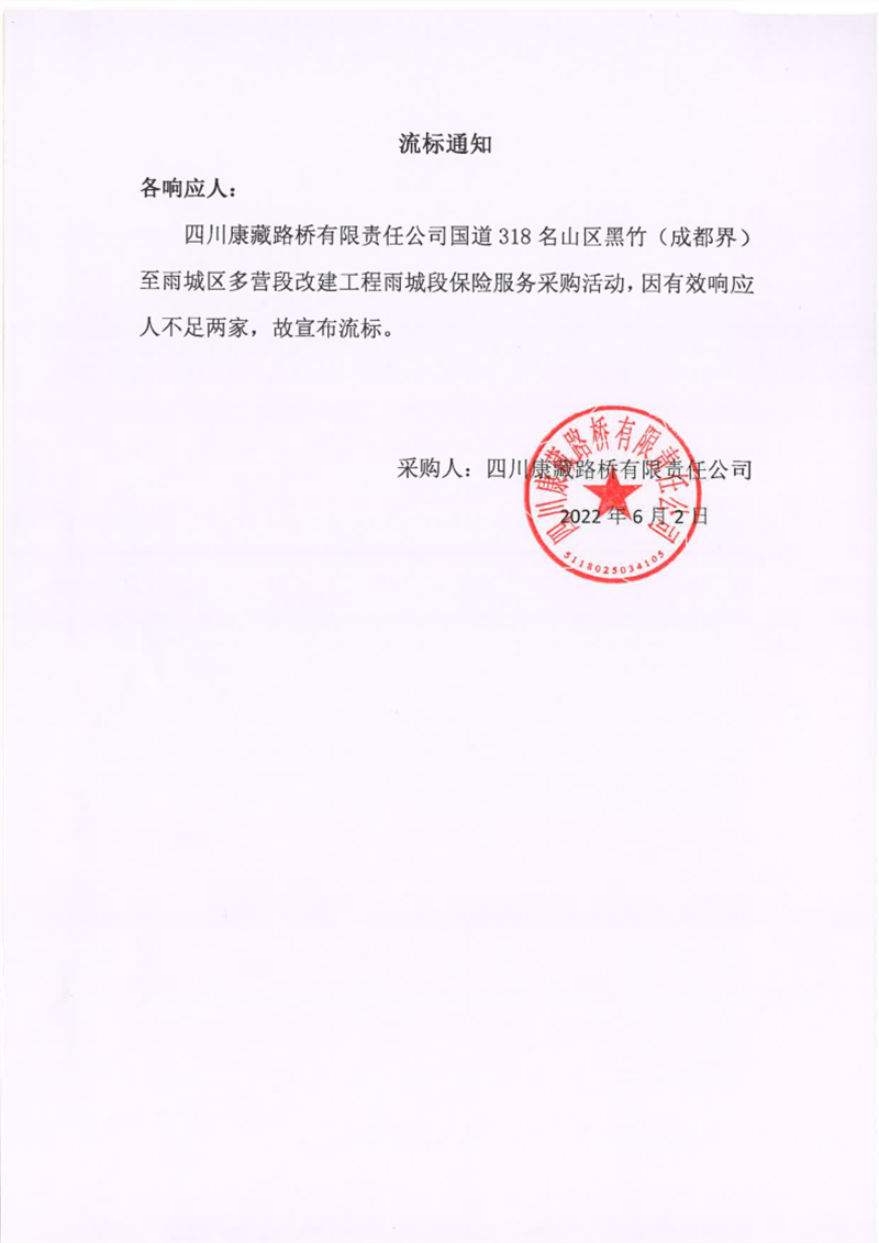 四川康藏路橋有限責(zé)任公司國道318名山區(qū)黑竹(成都界)至雨城區(qū)多營段改建工程雨城段保險服務(wù)采購流標通知