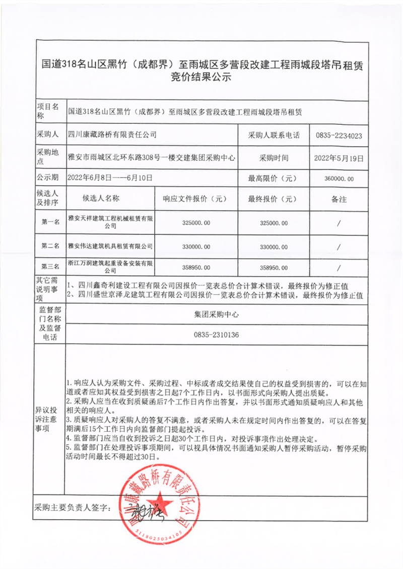 四川康藏路橋有限責(zé)任公司國道318名山區(qū)黑竹(成都界)至雨城區(qū)多營段改建工程雨城段塔吊租賃競(jìng)價(jià)結(jié)果公示