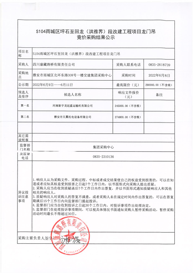 四川康藏路橋有限責(zé)任公司S104雨城區(qū)坪石至回龍(洪雅界)段改建工程項(xiàng)目龍門吊競(jìng)價(jià)采購(gòu)結(jié)果公示