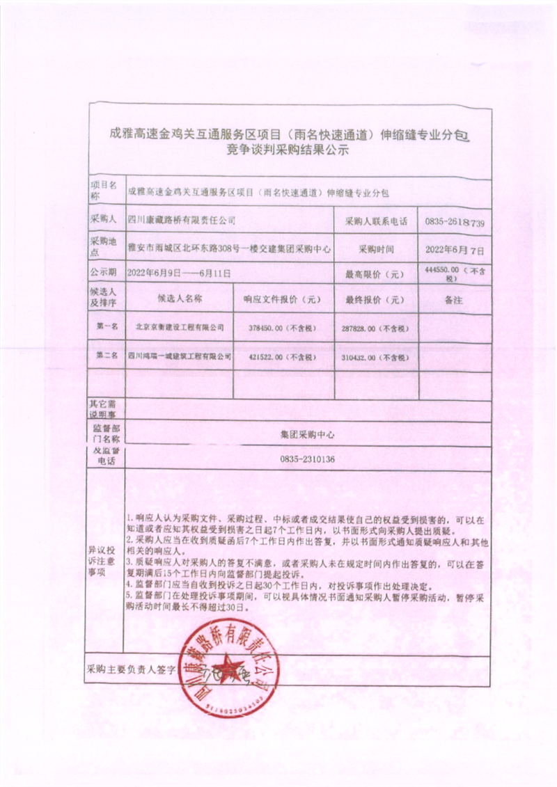 四川康藏路橋有限責(zé)任公司成雅高速金雞關(guān)互通服務(wù)區(qū)項目(雨名快速通道)伸縮縫工程專業(yè)分包競爭談判采購結(jié)果公示