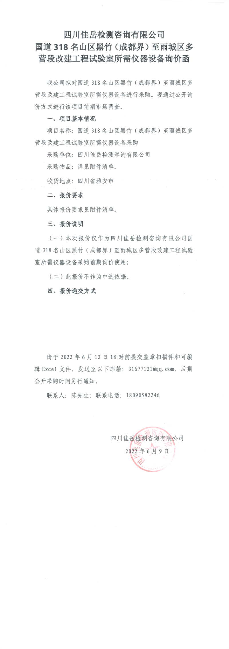 四川佳岳檢測咨詢有限公司國道318名山區(qū)黑竹(成都界)至雨城區(qū)多營段改建工程試驗(yàn)室所需儀器設(shè)備詢價(jià)函
