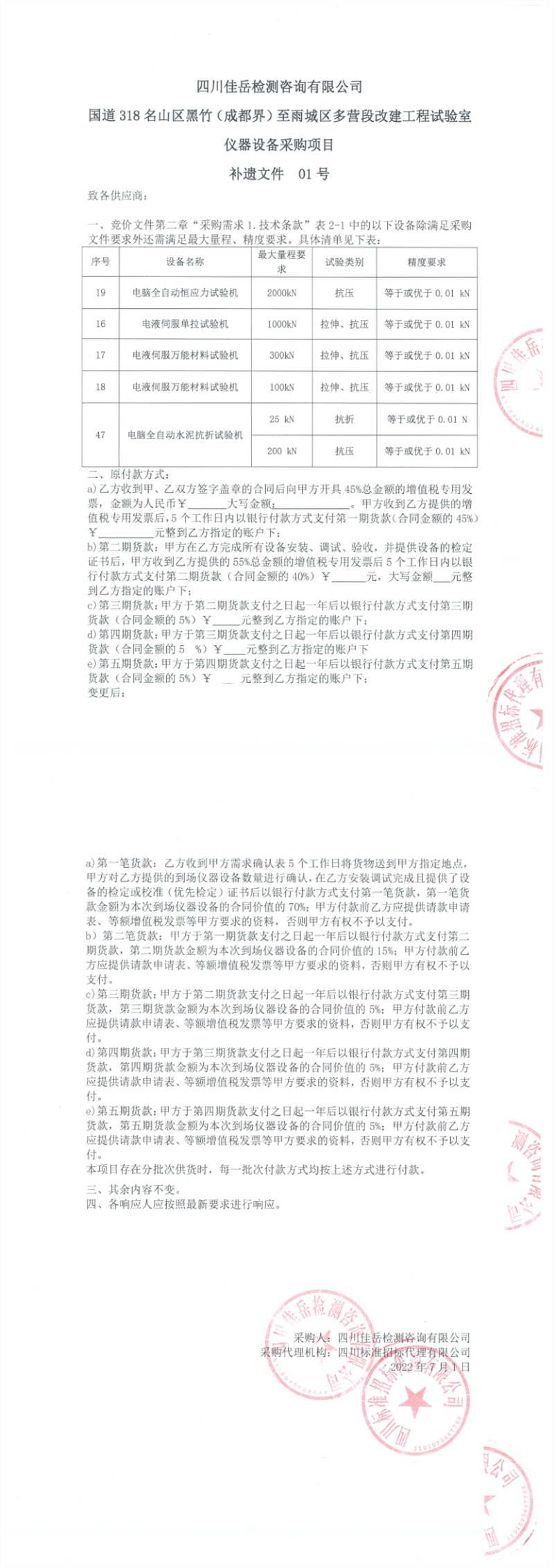 四川佳岳檢測(cè)咨詢(xún)有限公司國(guó)道318名山區(qū)黑竹(成都界)至雨城區(qū)多營(yíng)段改建工程試驗(yàn)室儀器設(shè)備采購(gòu)項(xiàng)目補(bǔ)遺文件01號(hào)