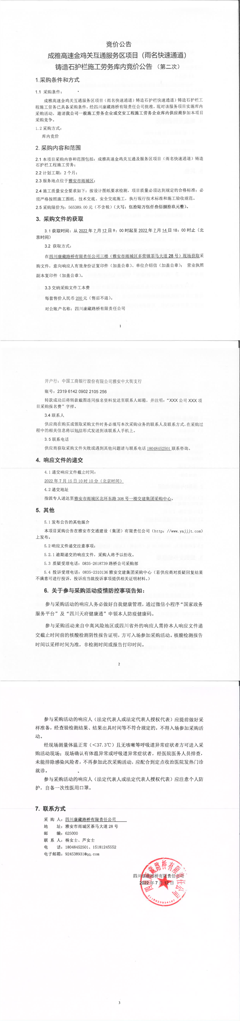 四川康藏路橋有限責任公司成雅高速金雞關(guān)互通服務(wù)區(qū)項目(雨名快速通道)鑄造石護欄施工勞務(wù)庫內(nèi)競價公告(第二次)