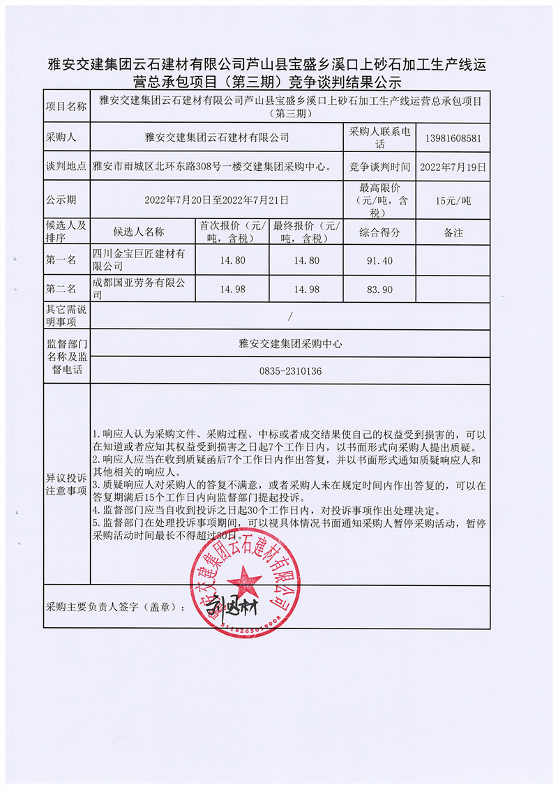 雅安交建集團云石建材有限公司蘆山縣寶盛鄉(xiāng)溪口上砂石加工生產(chǎn)線運營總承包項目(第三期)競爭談判結果公示
