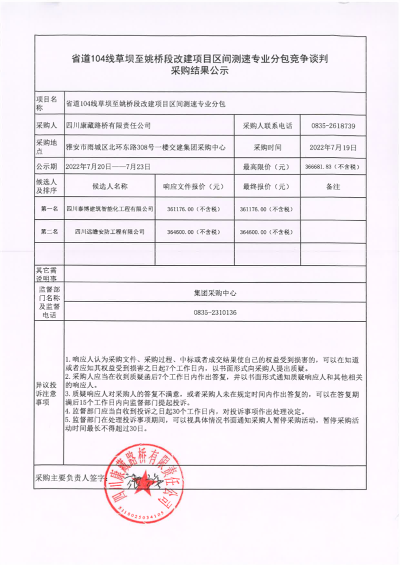 四川康藏路橋有限責(zé)任公司省道104線草壩至姚橋段改建項(xiàng)目區(qū)間測(cè)速專(zhuān)業(yè)分包競(jìng)爭(zhēng)談判采購(gòu)結(jié)果公示