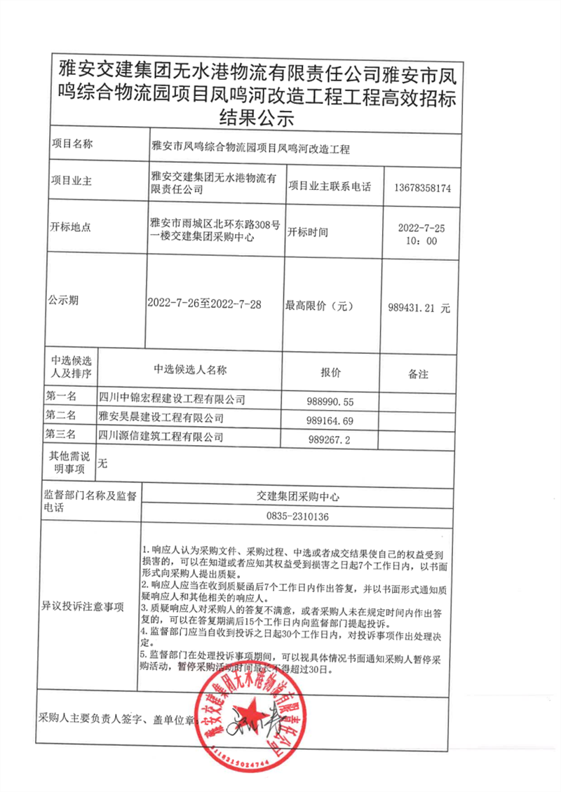 雅安交建集團(tuán)無(wú)水港物流有限責(zé)任公司雅安市鳳鳴綜合物流園鳳鳴河改造工程工程高效招標(biāo)結(jié)果公示
