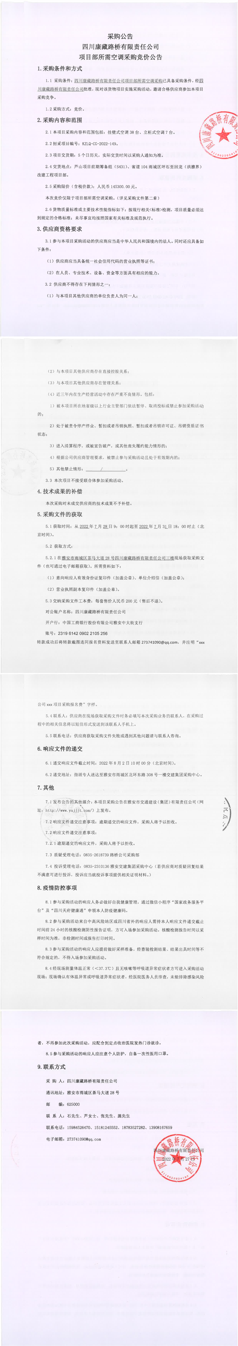 四川康藏路橋有限責(zé)任公司項(xiàng)目部所需空調(diào)采購(gòu)競(jìng)價(jià)公告