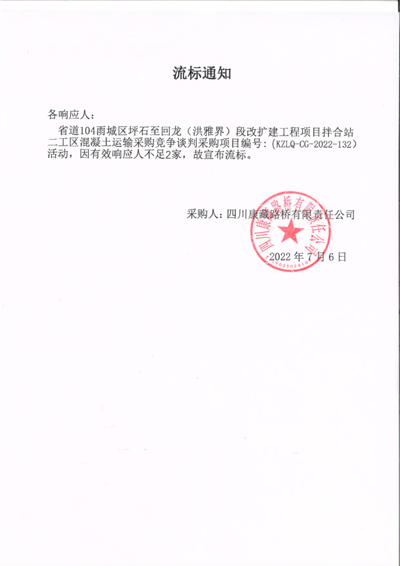 四川康藏路橋有限責(zé)任公司省道104線雨城區(qū)坪石至回龍(洪雅界)段改建工程項(xiàng)目拌合站二工區(qū)混凝土運(yùn)輸采購(gòu)競(jìng)爭(zhēng)談判采購(gòu)項(xiàng)目流標(biāo)通知