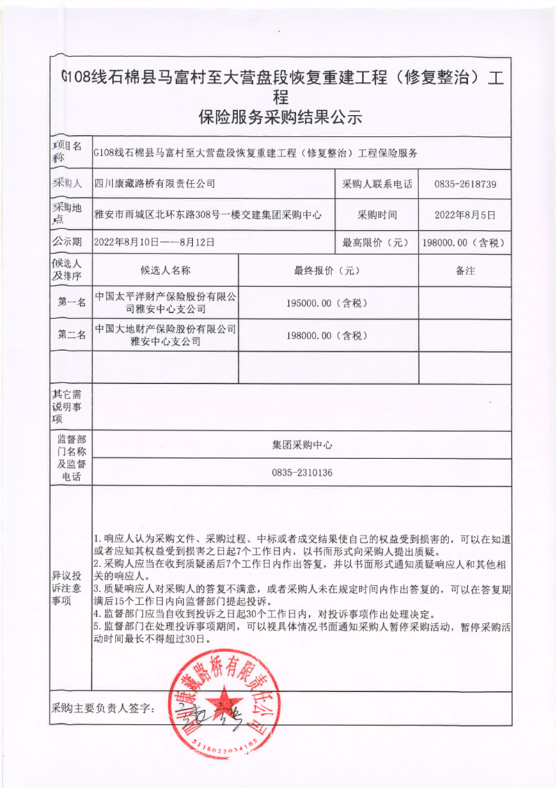 四川康藏路橋有限責任公司G108線石棉縣馬富村至大營盤段恢復重建工程(修復整治)工程保險服務采購結果公示