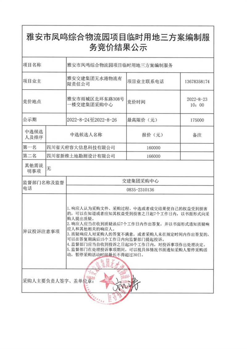 雅安交建集團無水港物流有限責任公司雅安市鳳鳴綜合物流園項目臨時用地三方案編制服務競價結(jié)果公示