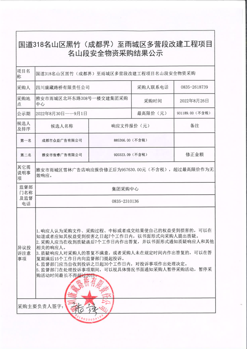 四川康藏路橋有限責任公司國道318名山區(qū)黑竹(成都界)至雨城區(qū)多營段改建工程項目名山段安全物資采購結果公示