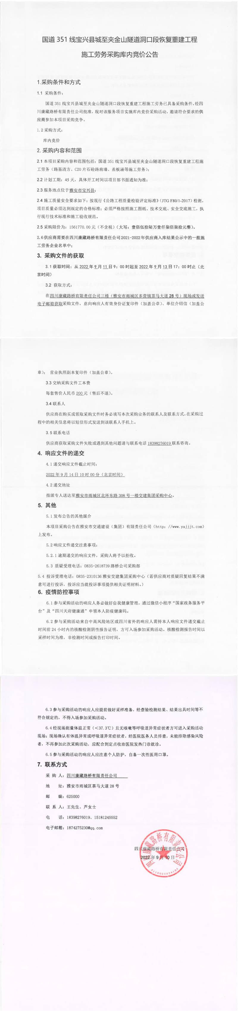 四川康藏路橋有限責任公司國道351線寶興縣城至夾金山隧道洞口段恢復重建工程施工勞務采購庫內(nèi)競價公告