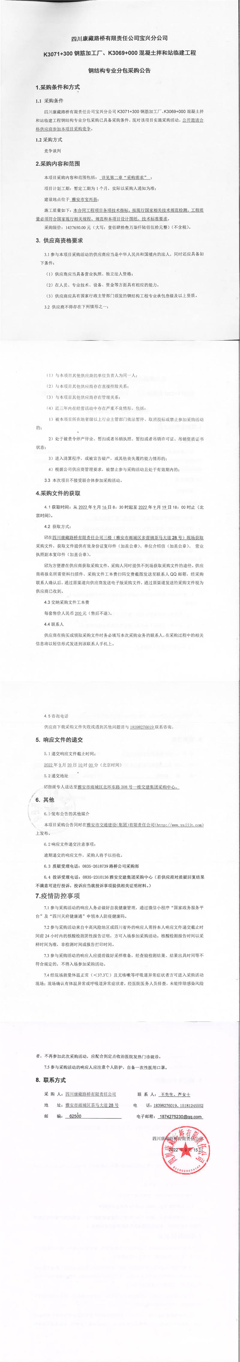 四川康藏路橋有限責任公司寶興分公司K3071+300鋼筋加工廠、K3069+000混凝土拌和站臨建工程鋼結(jié)構專業(yè)分包采購公告