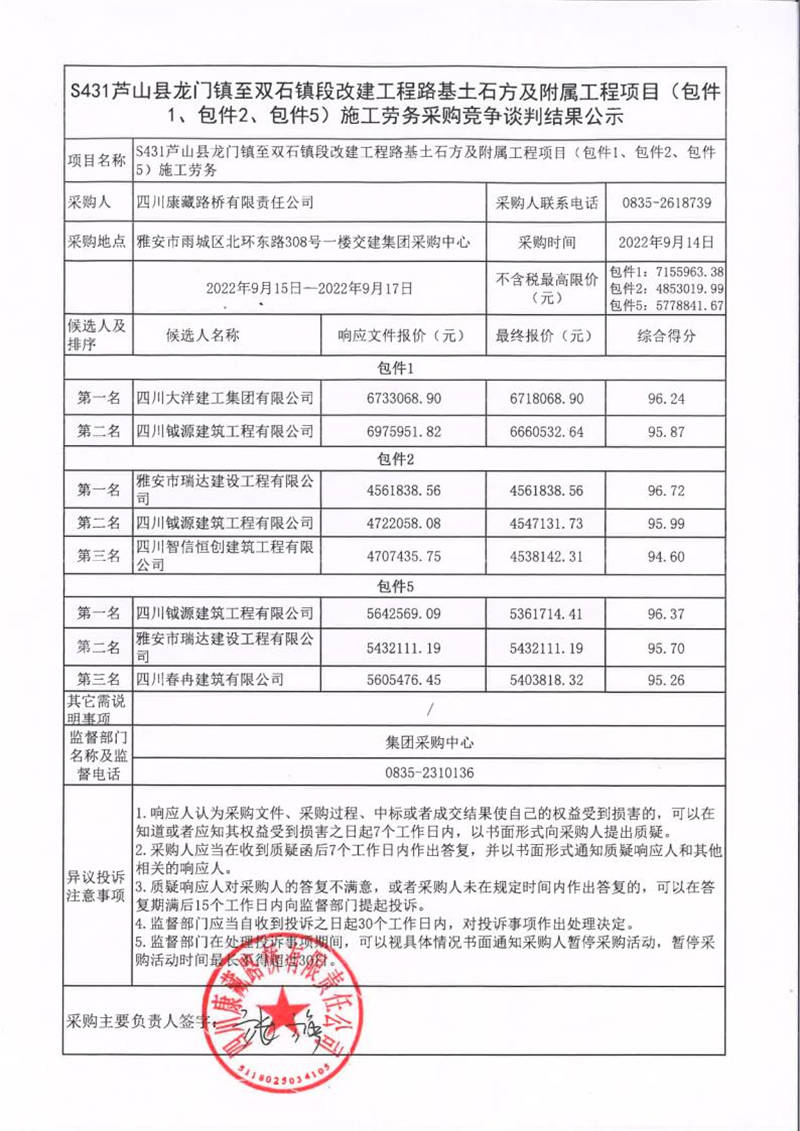 四川康藏路橋有限責(zé)任公司S431蘆山縣龍門鎮(zhèn)至雙石鎮(zhèn)段改建工程路基土石方及附屬工程項(xiàng)目(包件1、包件2、包件5)施工勞務(wù)采購競爭談判結(jié)果公示