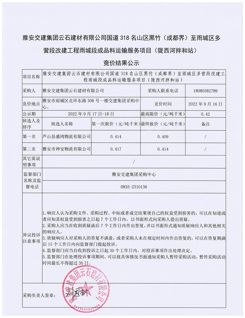 雅安交建集團(tuán)云石建材有限公司國(guó)道318名山區(qū)黑竹(成都界)至雨城區(qū)多營(yíng)段改建工程雨城段成品料運(yùn)輸服務(wù)項(xiàng)目(皇茶大道拌和站)競(jìng)價(jià)結(jié)果公示