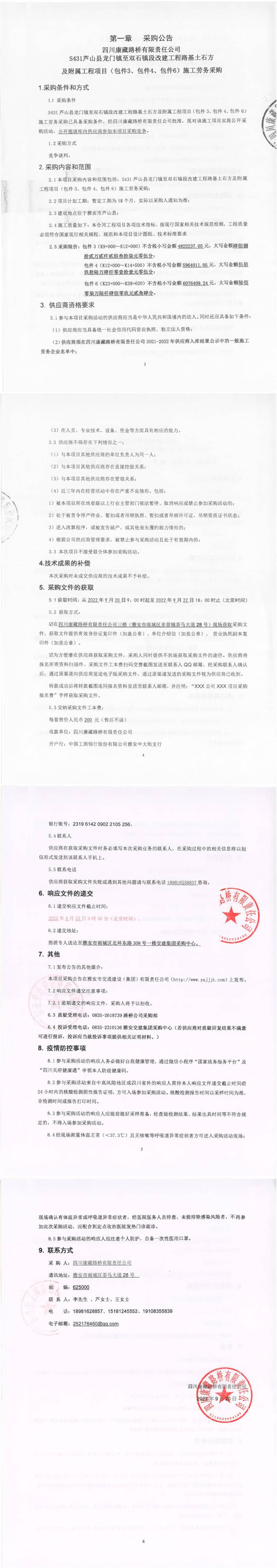 四川康藏路橋有限責(zé)任公司S431蘆山縣龍門鎮(zhèn)至雙石鎮(zhèn)段改建工程路基土石方及附屬工程項(xiàng)目(包件3、包件4、包件6)施工勞務(wù)采購(gòu)公告