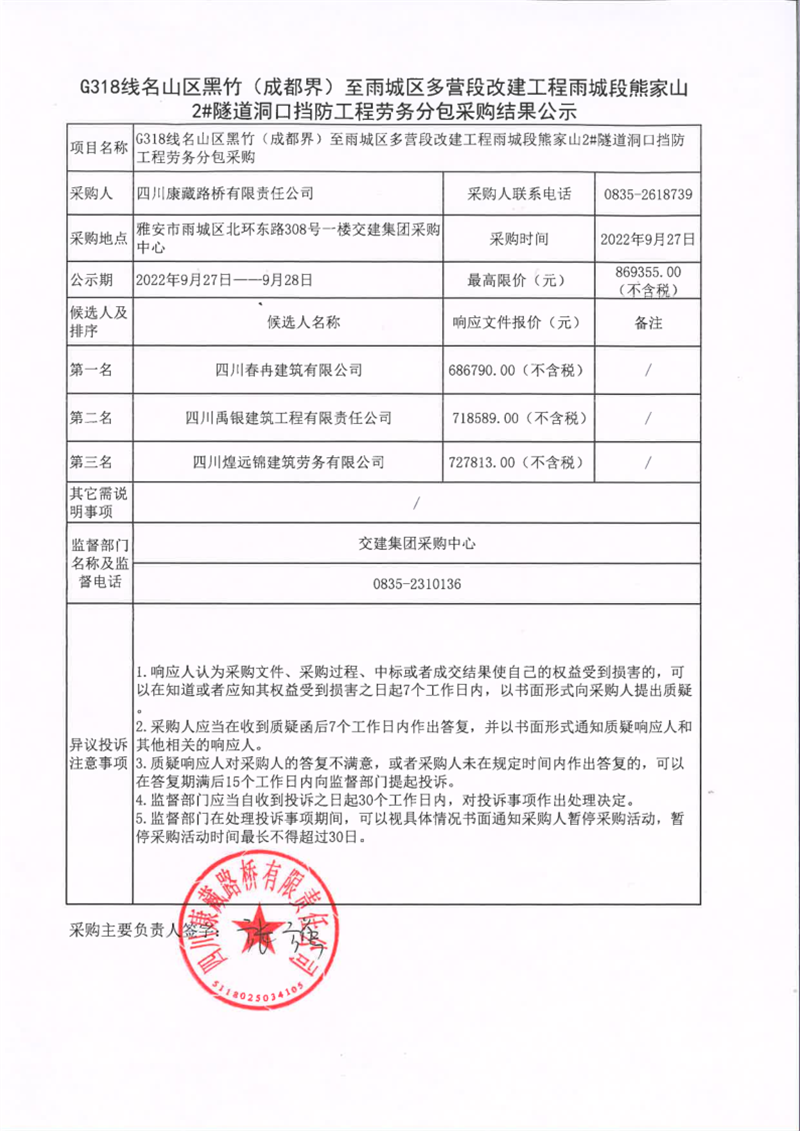 四川康藏路橋有限責任公司G318線名山區(qū)黑竹(成都界)至雨城區(qū)多營段改建工程雨城段熊家山2#隧道洞口擋防工程勞務分包采購結果公示