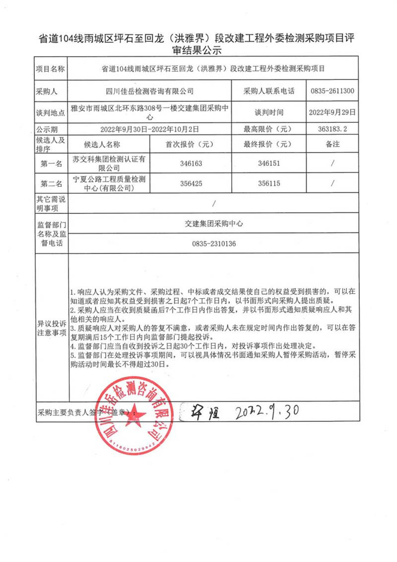 四川佳岳檢測咨詢有限公司省道104線雨城區(qū)坪石至回龍(洪雅界)段改建工程外委檢測采購項目評審結果公示