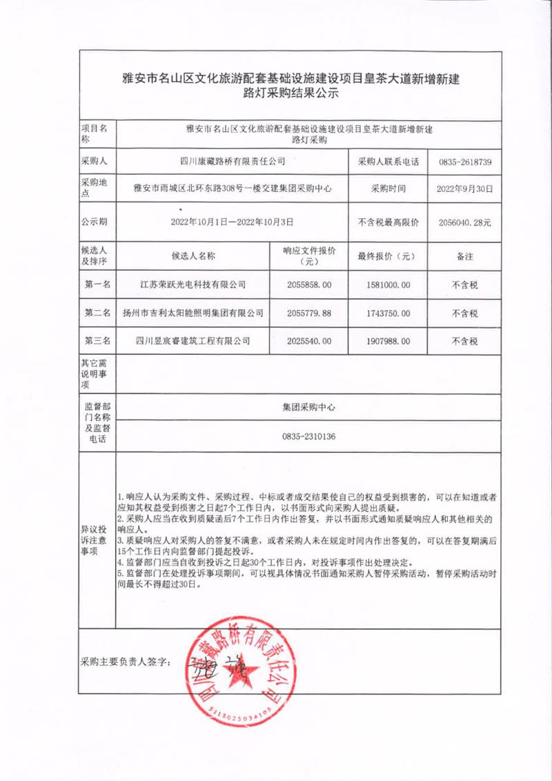 四川康藏路橋有限責(zé)任公司雅安市名山區(qū)文化旅游配套基礎(chǔ)設(shè)施建設(shè)項目皇茶大道新增新建路燈采購結(jié)果公示