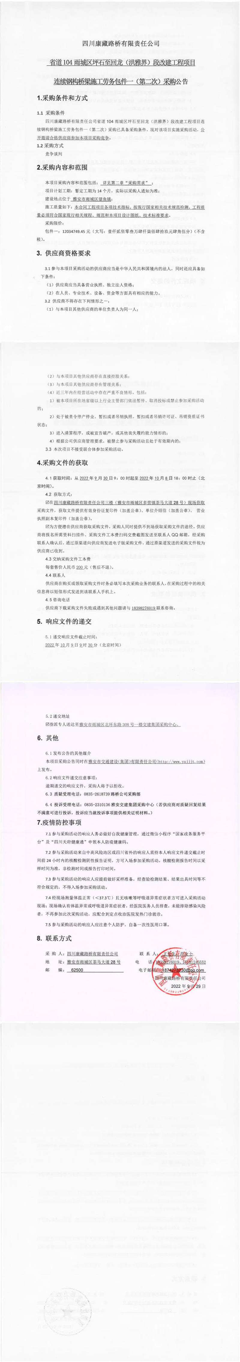 四川康藏路橋有限責(zé)任公司省道104雨城區(qū)坪石至回龍(洪雅界)段改建工程項(xiàng)目連續(xù)鋼構(gòu)橋梁施工勞務(wù)包件一(第二次)采購公告