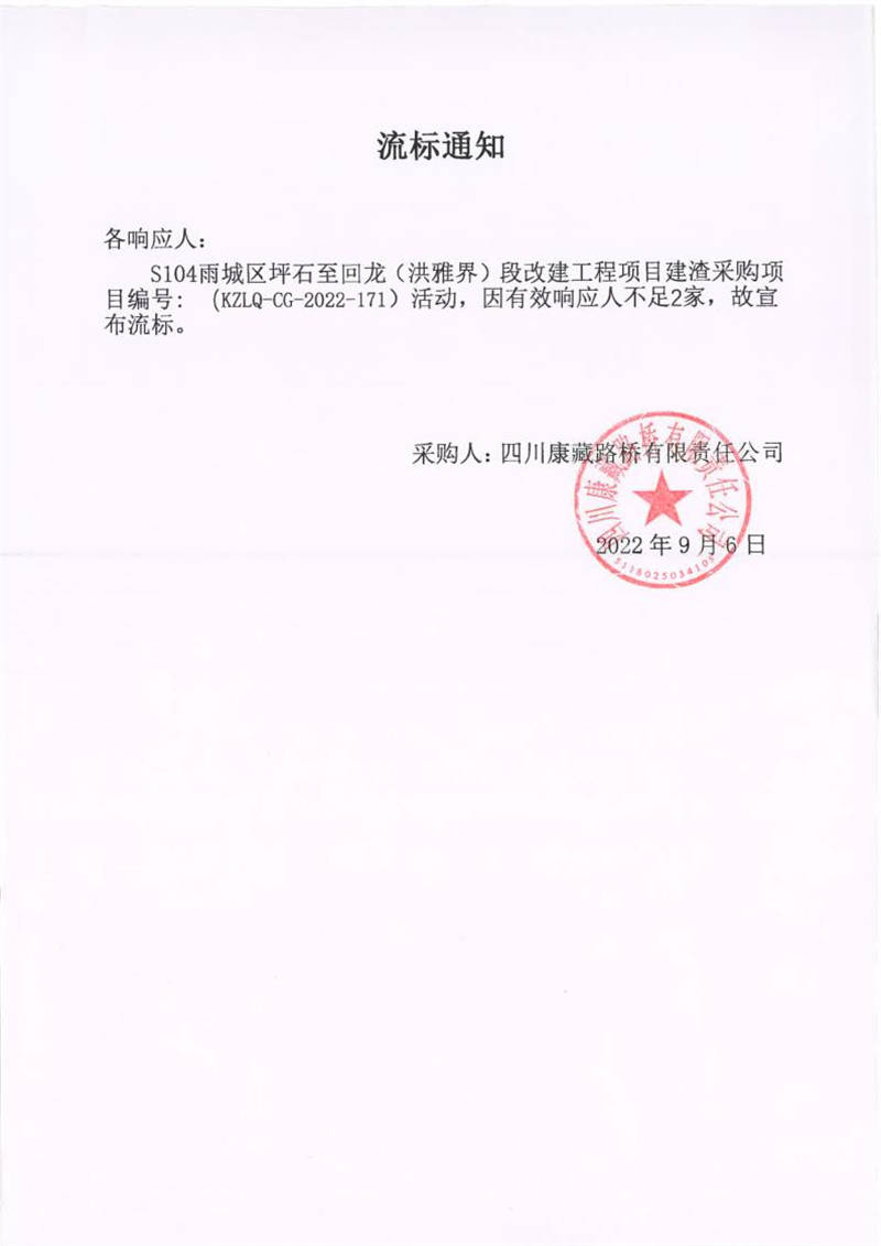 四川康藏路橋有限責(zé)任公司S104雨城區(qū)坪石至回龍(洪雅界)段改建工程項(xiàng)目建渣采購(gòu)項(xiàng)目流標(biāo)通知