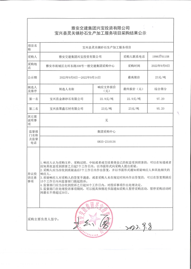雅安交建集團(tuán)興寶投資有限公司寶興縣靈關(guān)鎮(zhèn)砂石生產(chǎn)加工服務(wù)項目采購結(jié)果公示