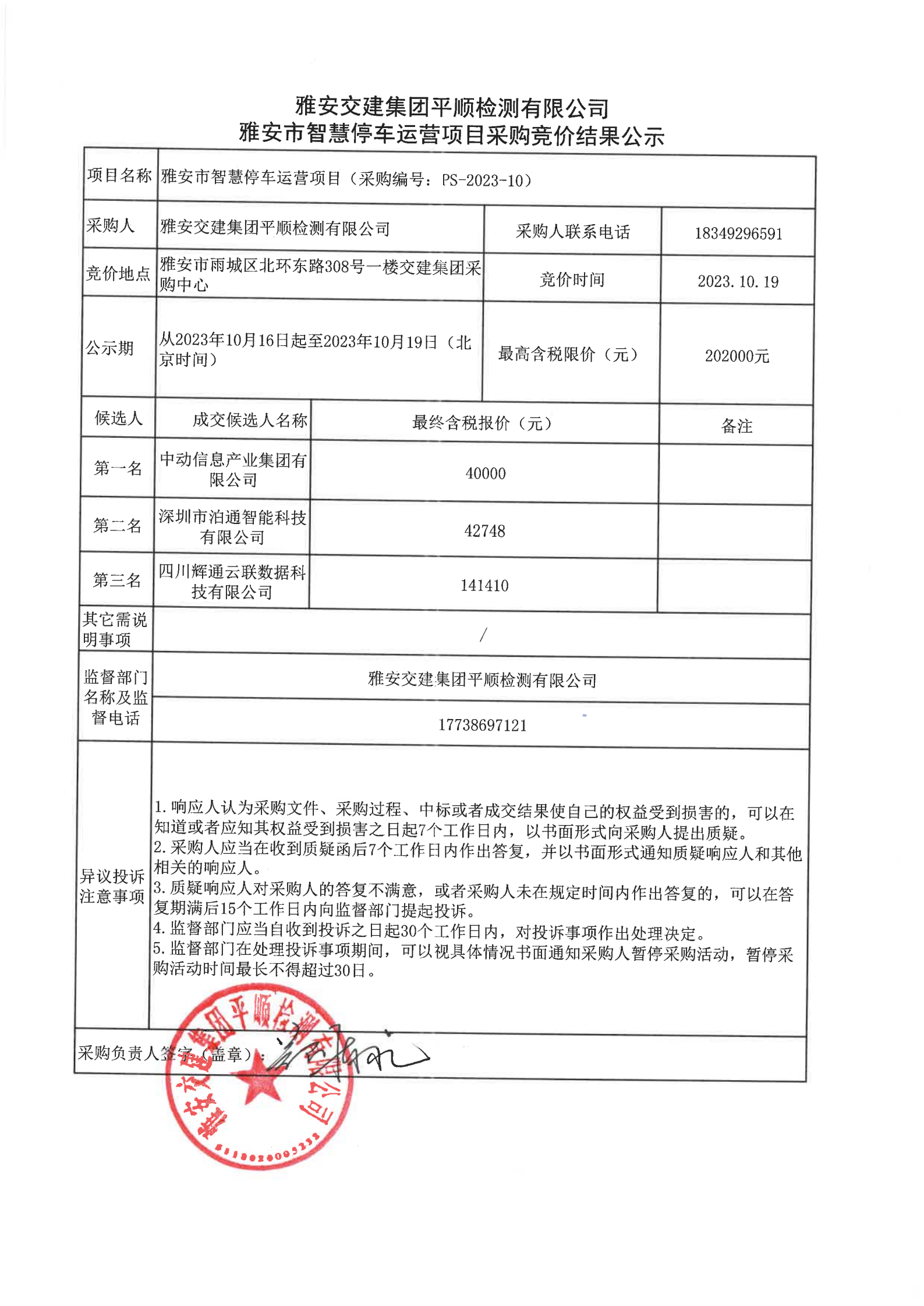 雅安交建集團(tuán)平順檢測有限公司雅安市智慧停車運(yùn)營項目采購競價結(jié)果公示
