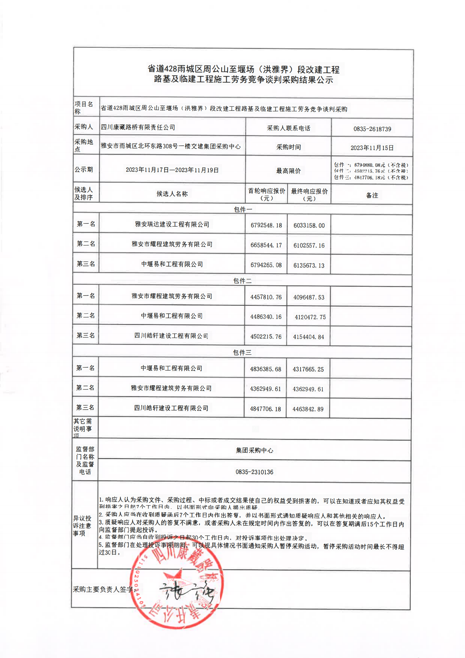 四川康藏路橋有限責(zé)任公司省道428雨城區(qū)周公山至堰場(chǎng)(洪雅界)段改建工程路基及臨建工程施工勞務(wù)競(jìng)爭(zhēng)談判采購結(jié)果公示