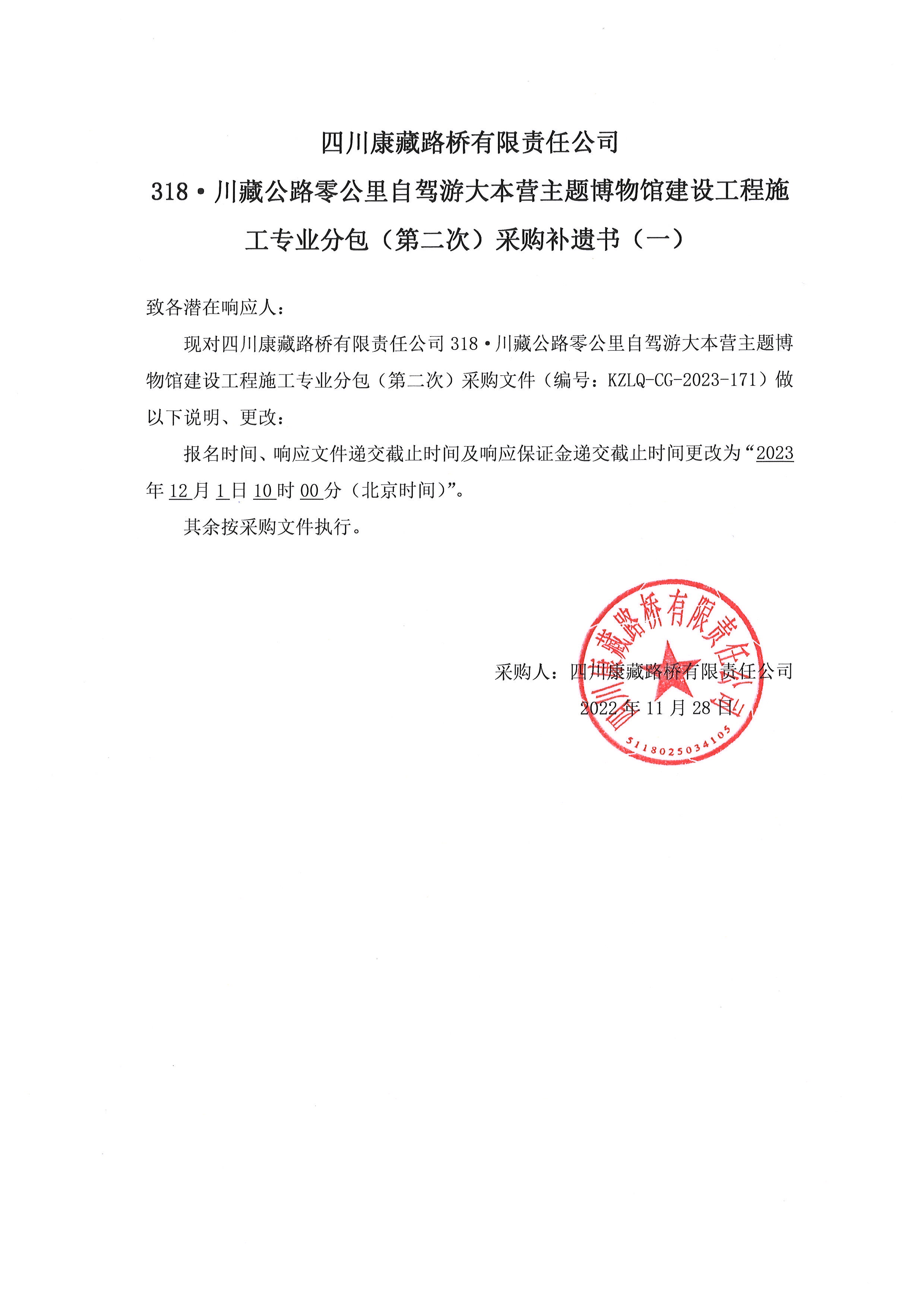 四川康藏路橋有限責(zé)任公司318·川藏公路零公里自駕游大本營(yíng)主題博物館建設(shè)工程施工專業(yè)分包(第二次)采購(gòu)補(bǔ)遺書(shū)(一)