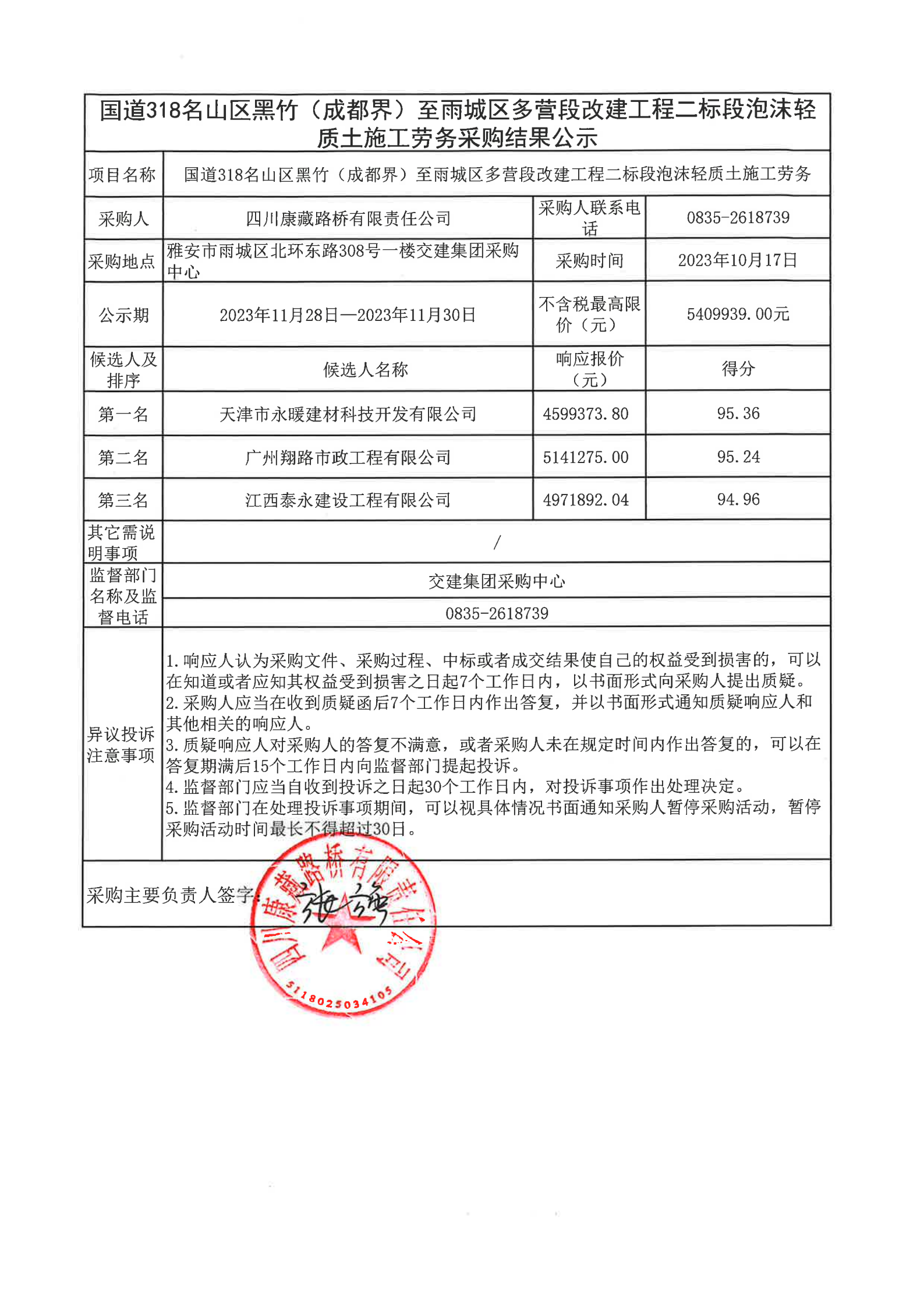四川康藏路橋有限責(zé)任公司國道318名山區(qū)黑竹(成都界)至雨城區(qū)多營段改建工程二標段泡沫輕質(zhì)土施工勞務(wù)采購結(jié)果公示