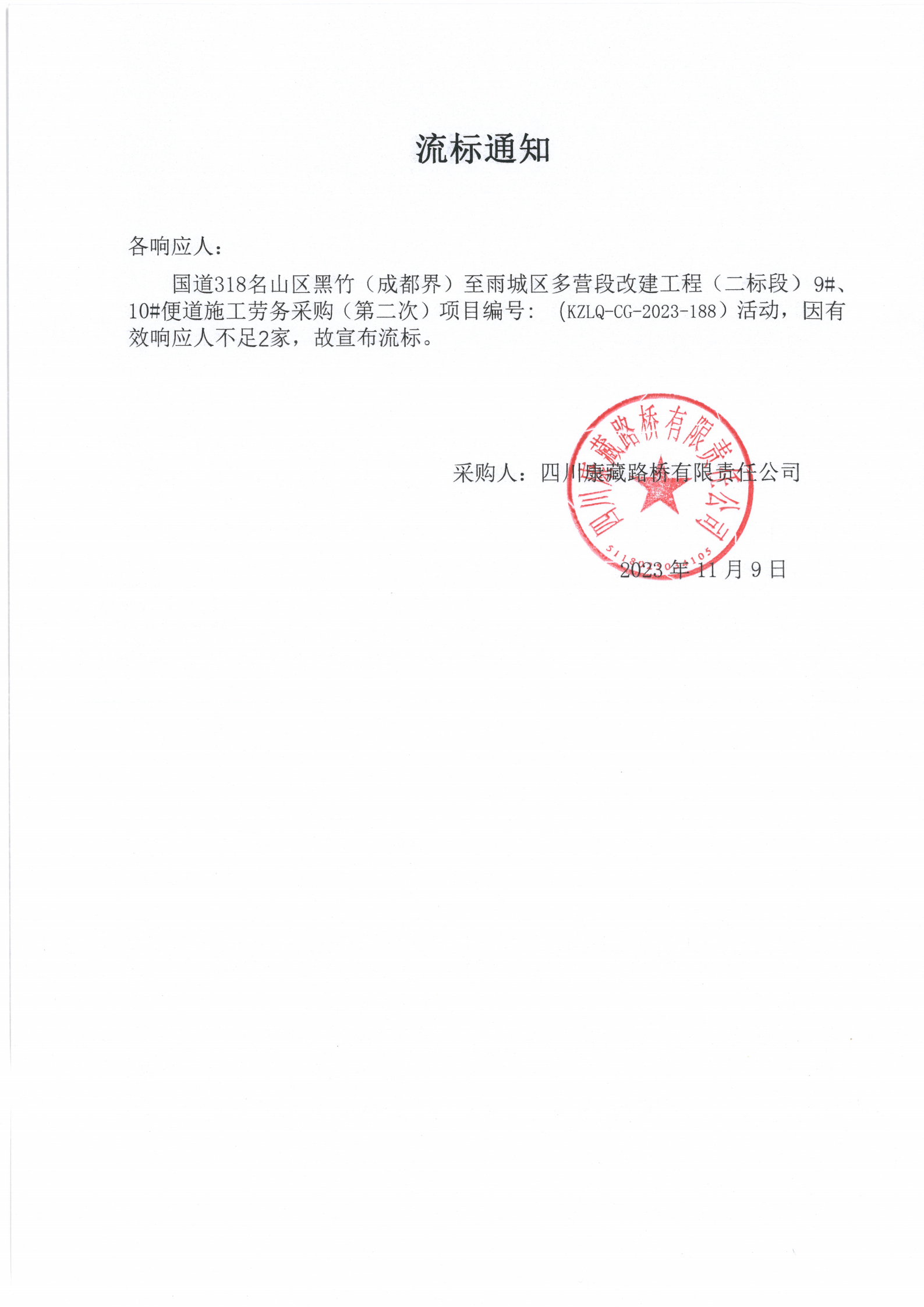 四川康藏路橋有限責(zé)任公司國道318名山區(qū)黑竹(成都界)至雨城區(qū)多營段改建工程二標(biāo)段9#、10#便道施工勞務(wù)采購(第二次)流標(biāo)通知