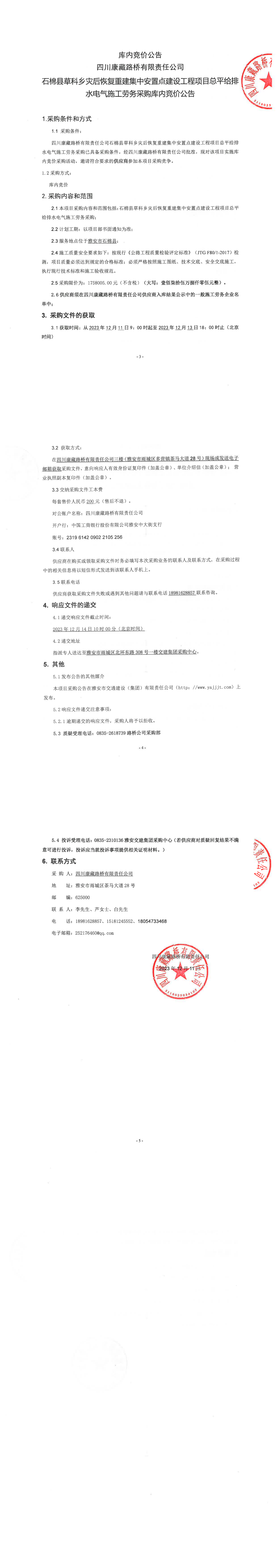 四川康藏路橋有限責(zé)任公司石棉縣草科鄉(xiāng)災(zāi)后恢復(fù)重建集中安置點(diǎn)建設(shè)工程項(xiàng)目總平給排水電氣施工勞務(wù)采購庫內(nèi)競(jìng)價(jià)公告