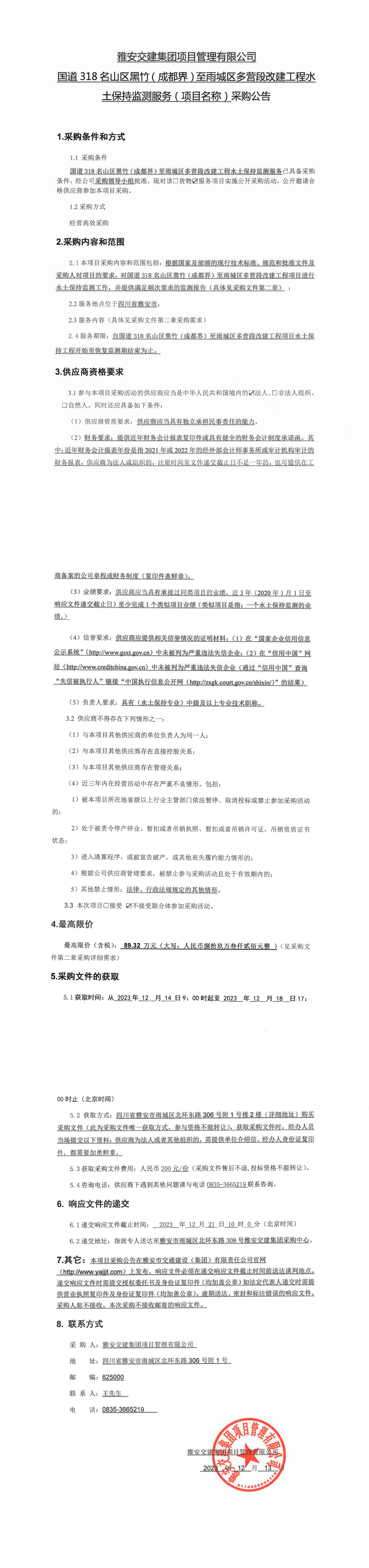 雅安交建集團(tuán)項目管理有限公司國道318名山區(qū)黑竹(成都界)至雨城區(qū)多營段改建工程水土保持監(jiān)測服務(wù)(項目名稱)采購公告