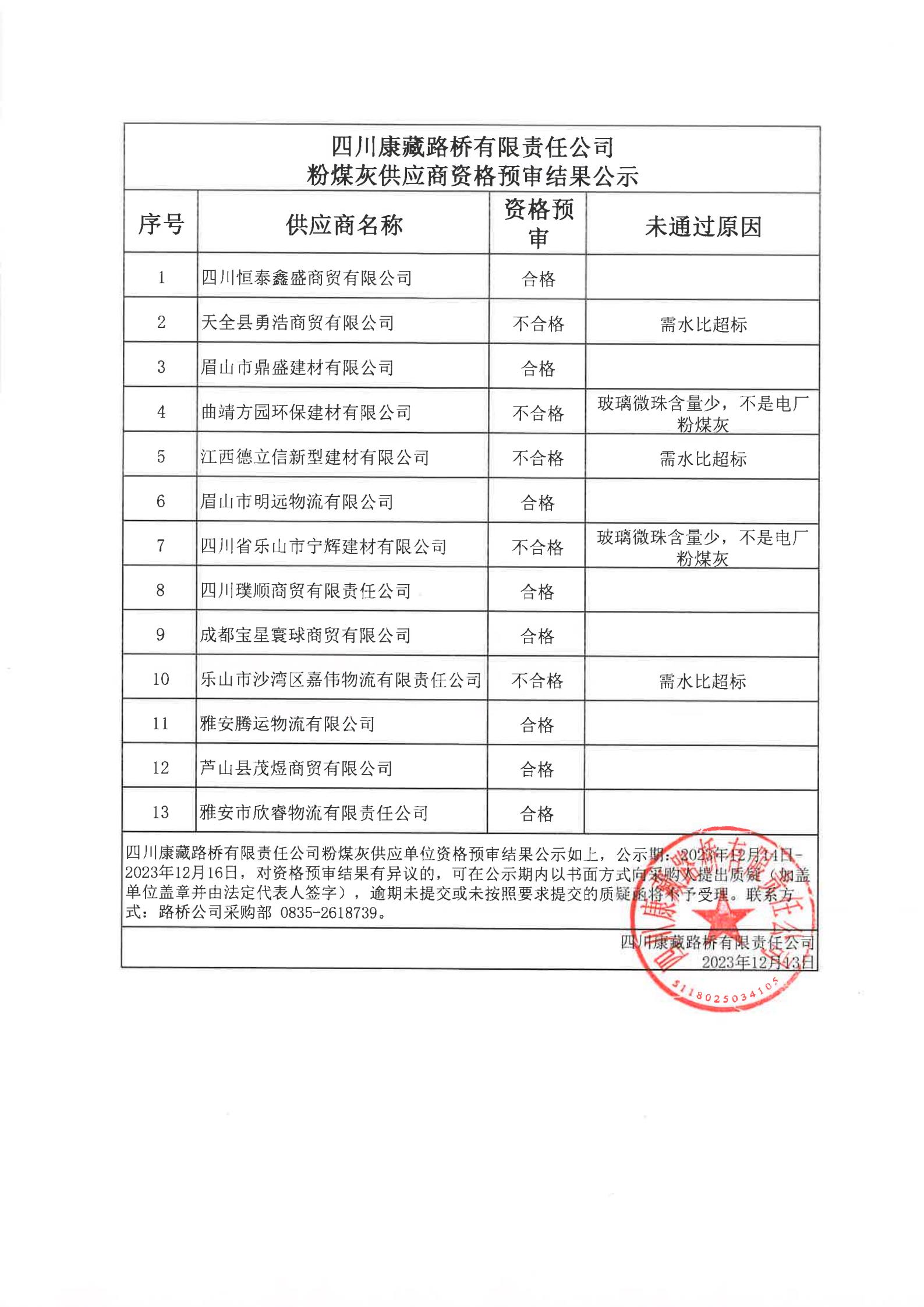 四川康藏路橋有限責任公司粉煤灰供應(yīng)商資格預(yù)審結(jié)果公示