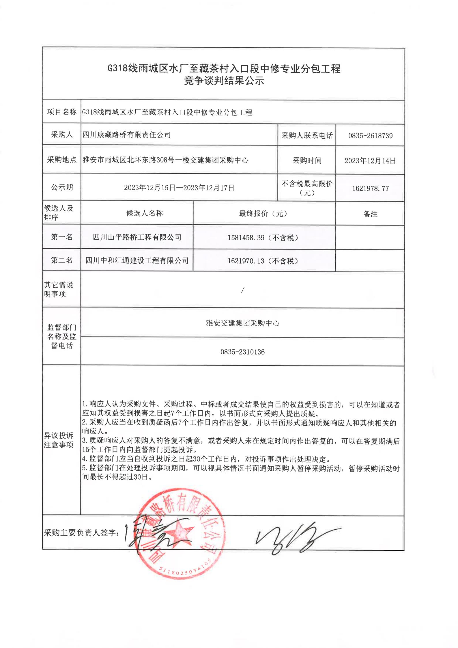 四川康藏路橋有限責任公司G318線雨城區(qū)水廠至藏茶村入口段中修專業(yè)分包工程競爭談判結(jié)果公示